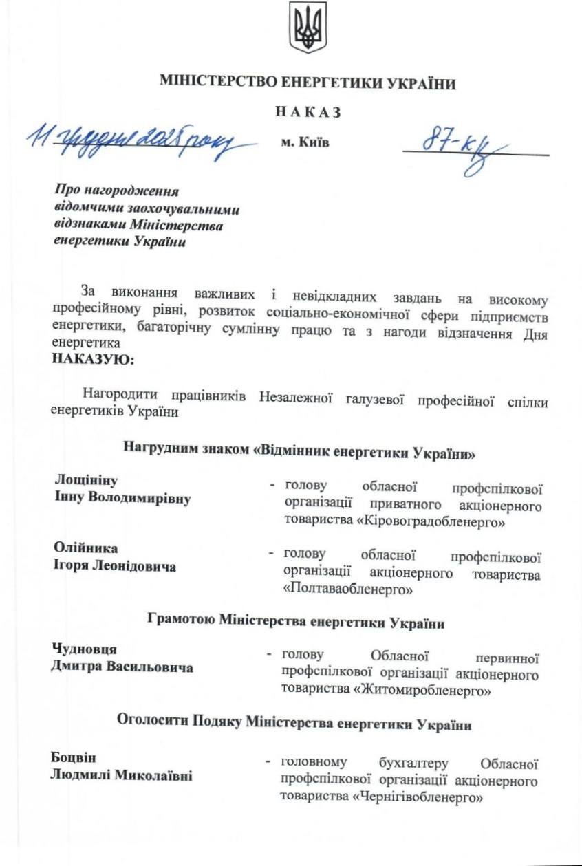 Виборних та штатних працівників організаційних ланок Профспілки відзначено відомчими заохоченнями Міністерства енергетики України. Вітаємо колег!